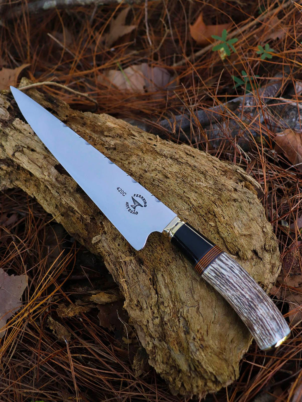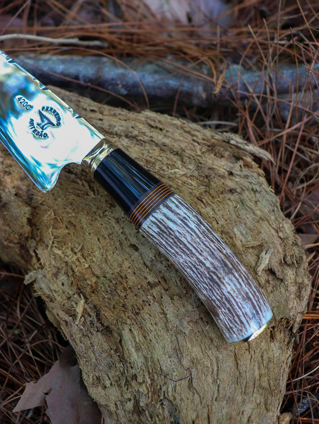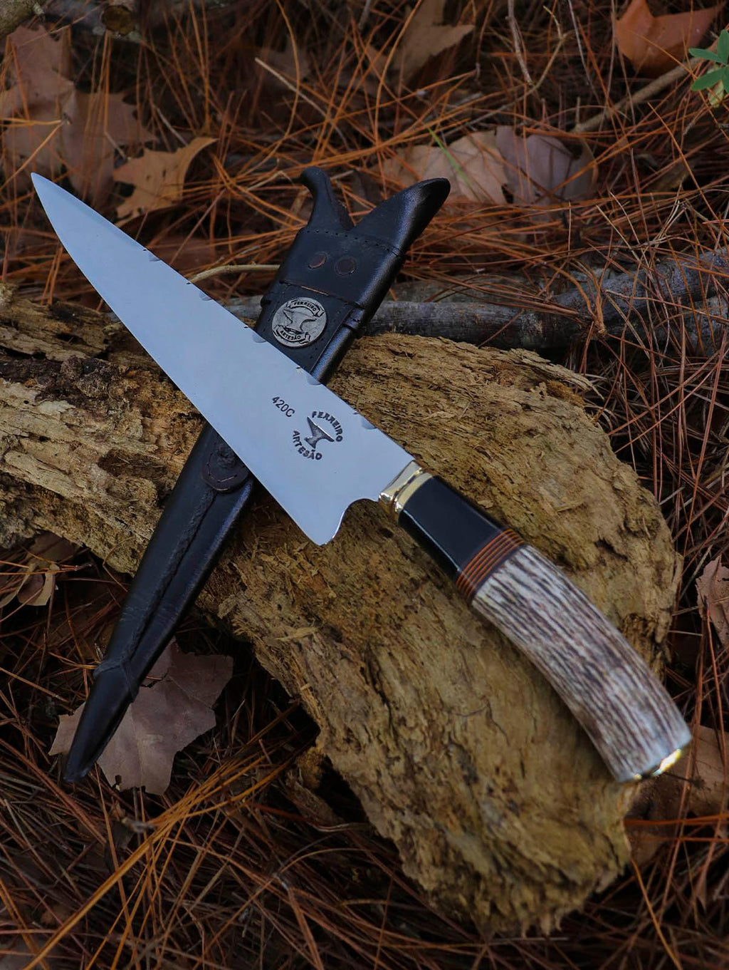 Cabo Confortável e Durável: O cabo é construído com resina preta, proporcionando uma pegada firme e confortável durante o uso prolongado. Os detalhes em chifre de cervo acrescentam um toque de rusticidade e autenticidade, enquanto a fórmica laranja confere um visual vibrante e moderno.